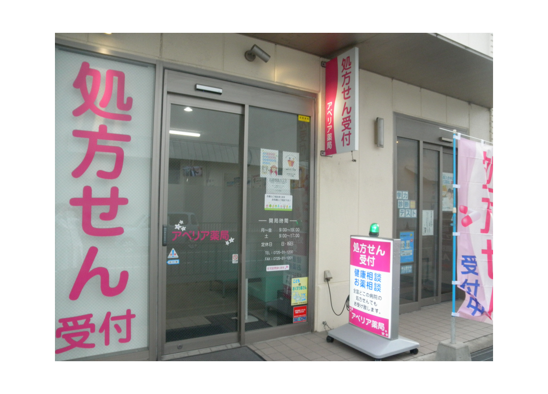 大阪府泉大津駅前にある、アベリア薬局です。 入口が小さいためわかりにくいかもしれませんが、皆様のお越しをお待ちしております。 眼科の処方箋のみならず、全国どこの処方箋も受け付けております。 処方箋が無くてもお薬、健康相談承っております。