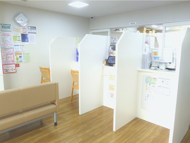 広い駐車場があり、白を基調とした明るく開放的な店舗です。処方箋をお持ちでない方も、お薬の飲み合わせ、健康相談などお気軽にご来局ください。
