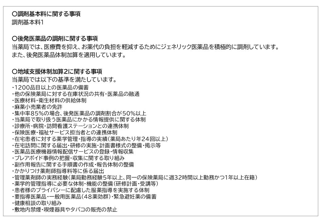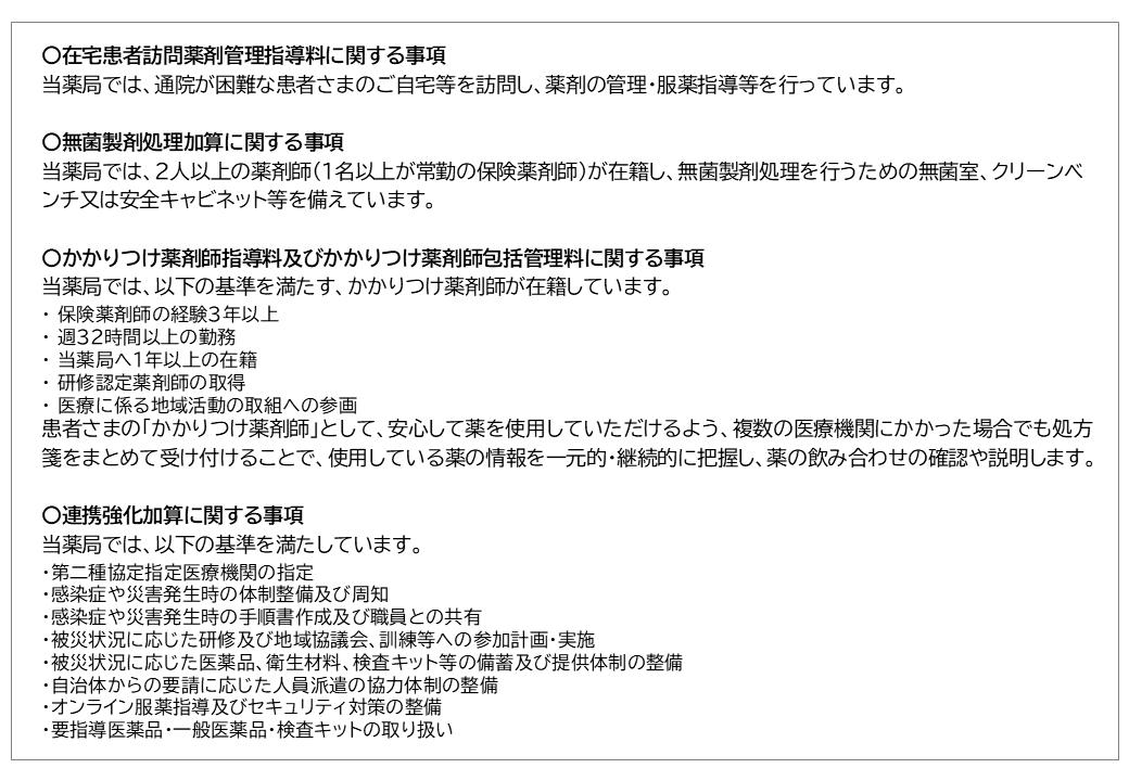 薬の専門家として、患者様の健康と暮らしをサポートし信頼される薬局を目指して、スタッフ一同日々精進しております。